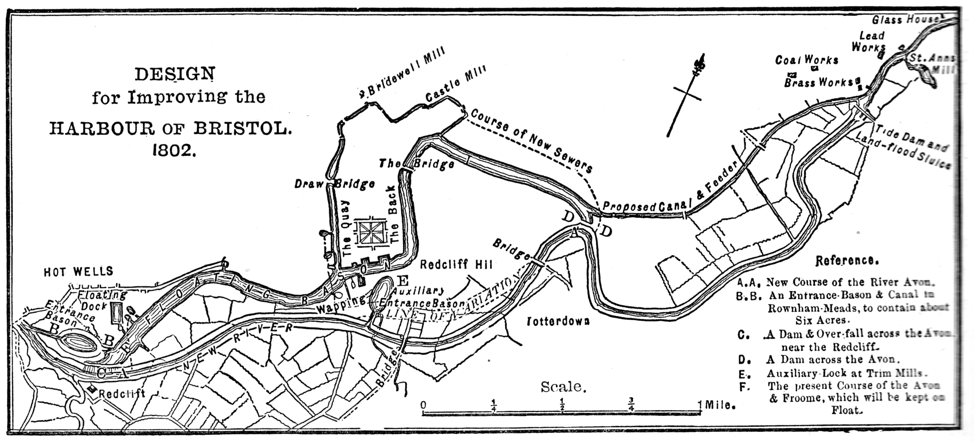 The new company decided to engage one of the most celebrated harbour engineers of the day, William Jessop. He had been senior consulting engineer for the docks at Dublin in the 1790s and had just completed working on the West India Dock in London in 1800. By 1802, Jessop himself had submitted three different Bristol schemes, revising each based on committee suggestions. Then the committee asked him to make significant changes that meant the design closely resembled an idea from one Reverend William Milton, who had submitted his plan back in 1791. Milton’s idea was a tidal bypass that preserved some current flowing past the harbour, helping to carry ships to and from the entrance. Exhausted with Bristol’s indecision, Jessop was “probably ready to agree to more or less anything that would mean the project would be approved.”3 and he quickly provided the engineering details for Milton’s layout.